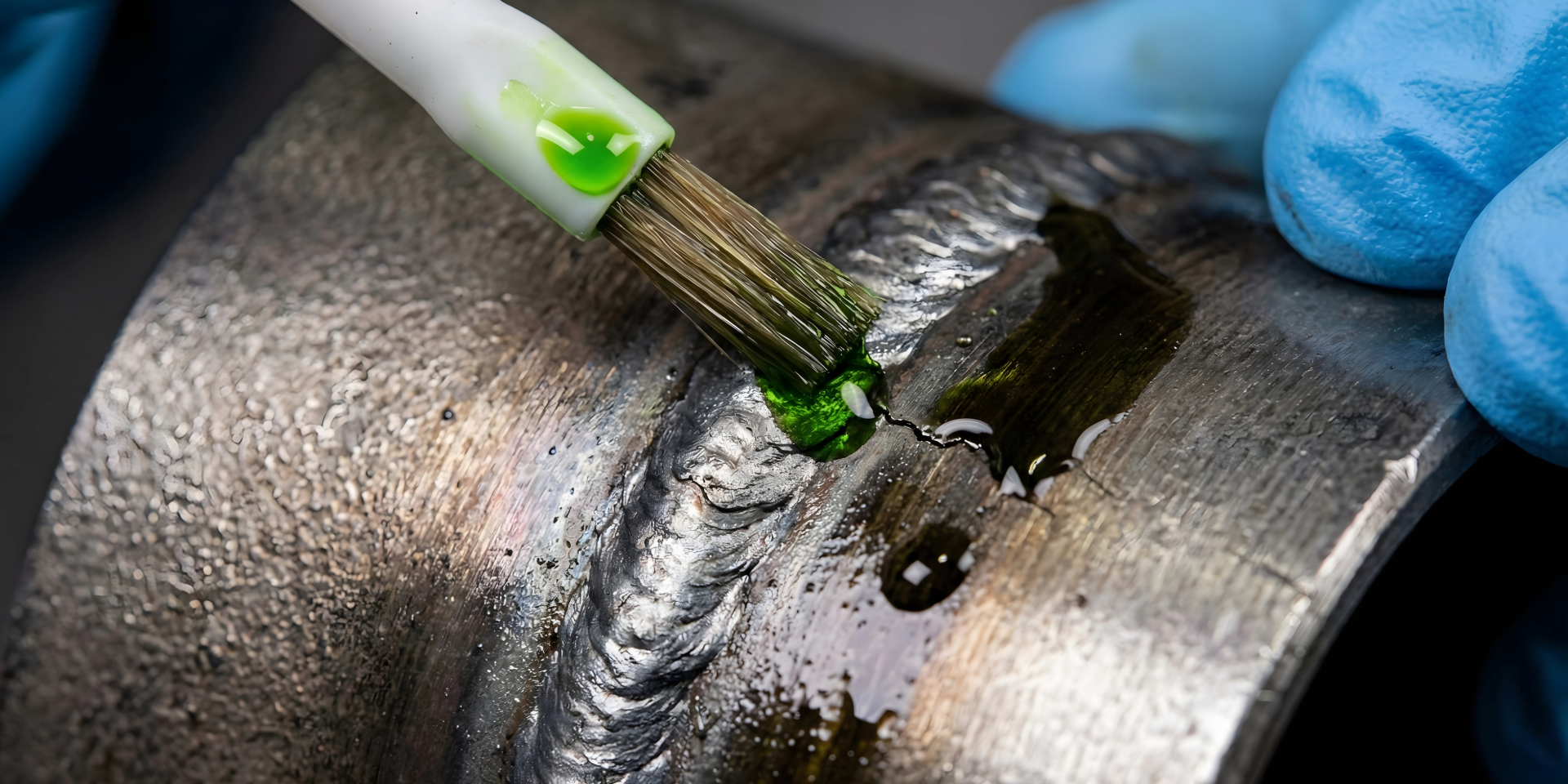 A liquid dye is applied to reveal surface-breaking defects such as cracks and porosity. It is simple, reliable, and widely used across industries.